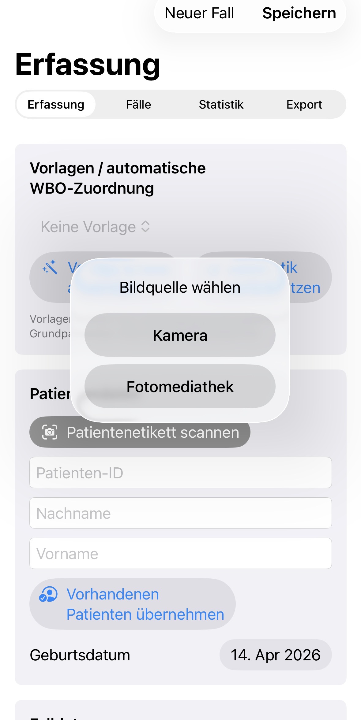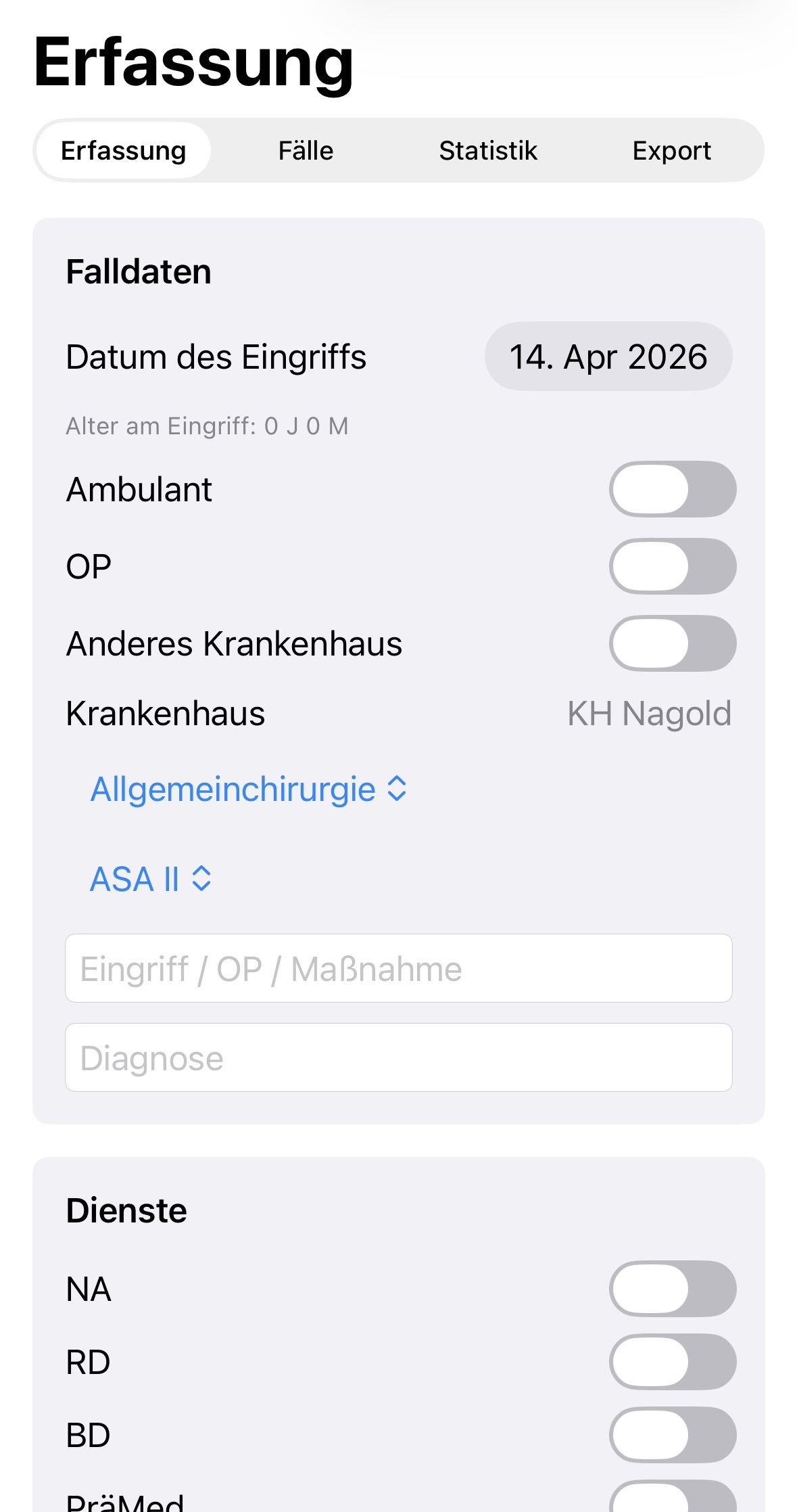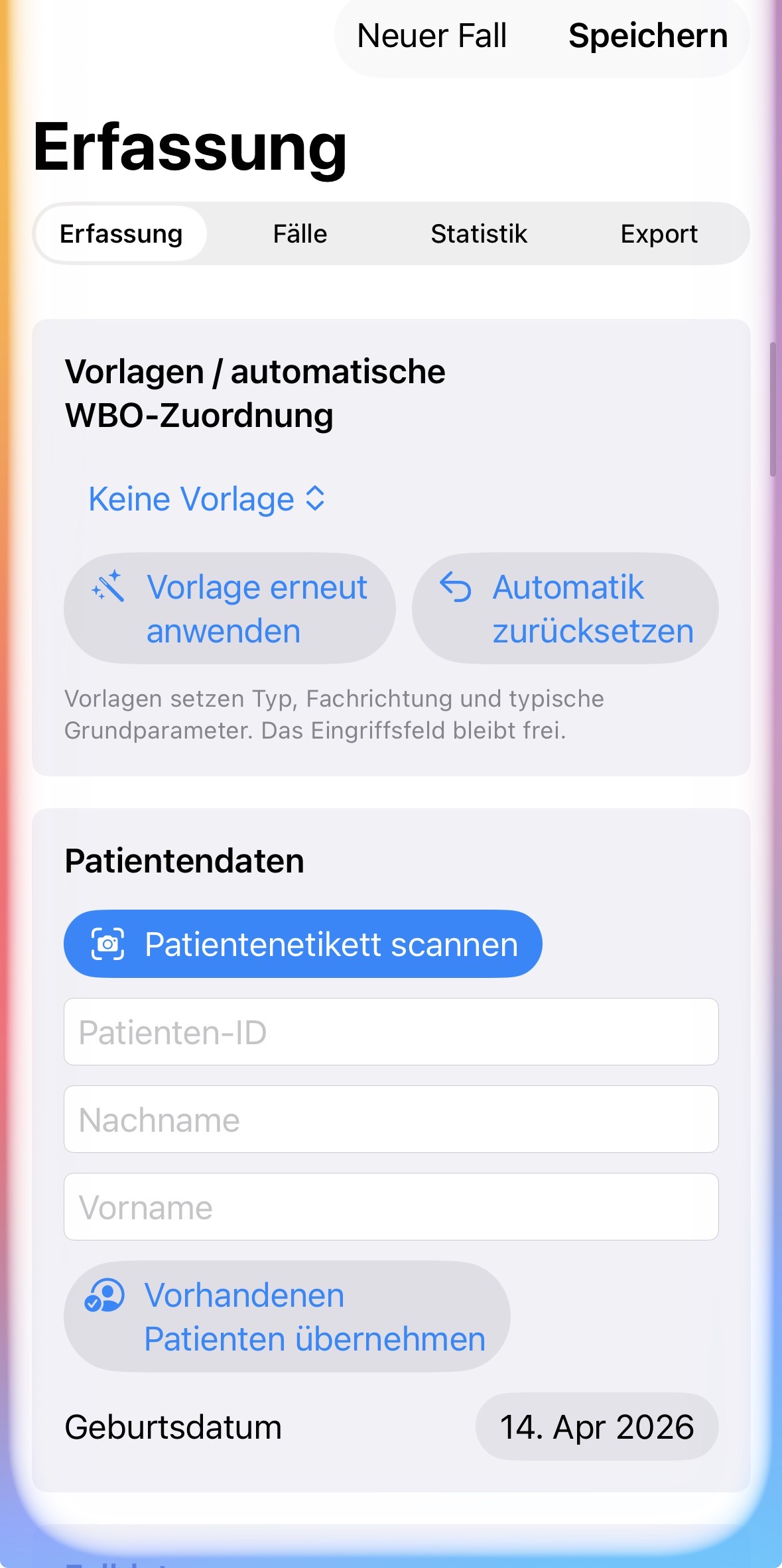 Betrachten Sie die übersichtliche Fallliste und erfassen Sie neue Eingriffe intuitiv direkt in der Anwendung für Ihre Weiterbildung.
