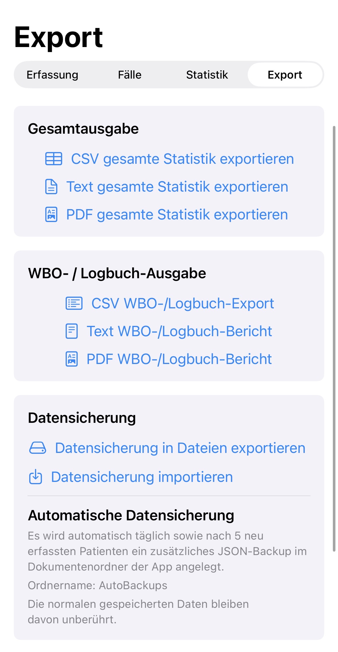 Einblicke in Fallübersicht, Falldetails, Statistik, Export und Datensicherung.